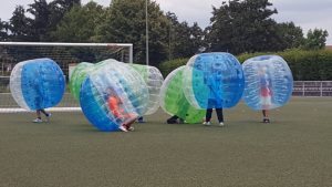 sogar einige Kicker der FBB trauten mitzumachen. Das vorbereitete Turnier musste nach zwei Spielen angepasst werden, da manche Kinder erstmal genug hatten abgeräumt zu werden und andere während des Zuschauens Lust bekamen sich am Umschubsen von Gegnern sowie Mitspielern zu beteiligen. Während die Bubble-Spieler alle vier Minuten rotierend wechselten, wurde auf dem Rasen Kinder Soccer-Dart aufgebaut. Dabei konnten alle Kinder versuchen möglichst viele Punkte mit drei Klettbällen auf der Scheibe zu schießen und ihr Ergebnis auf einer Urkunde verewigt mitzunehmen. Auf der anderen Seite hatten die belustigten Eltern den Eindruck, dass den Kids die Bubbles ausreichen, weil dem eigentlichen Spielgerät kaum Beachtung geschenkt wurde. Das bestätigte sich als die Trainer den Fußball aus dem Spiel den Ball entfernten. Bubble-Spieler standen auf dem Kopf, kugelten über das Feld, mussten sich teilweise beim Schießen zurücklehnen, um die Beine zum Fußball zu strecken, der wegen zu kurzer Beine nicht unter den Bubble passte. Dabei fielen sie auf den Rücken und mussten sich erst wieder auf den Bauch drehen, um kniend aufzustehen. Ergebnisse der 4 gegen 4 Spiele war unwichtig, dennoch vielen einige Tore.