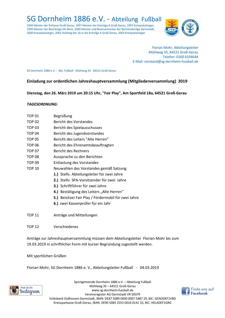 Am Dienstag, den 26.03.2019 findet unsere Jahreshauptversammlung statt. Los geht es um 20:15 im unserem Fair Play am Sportplatz in Dornheim.