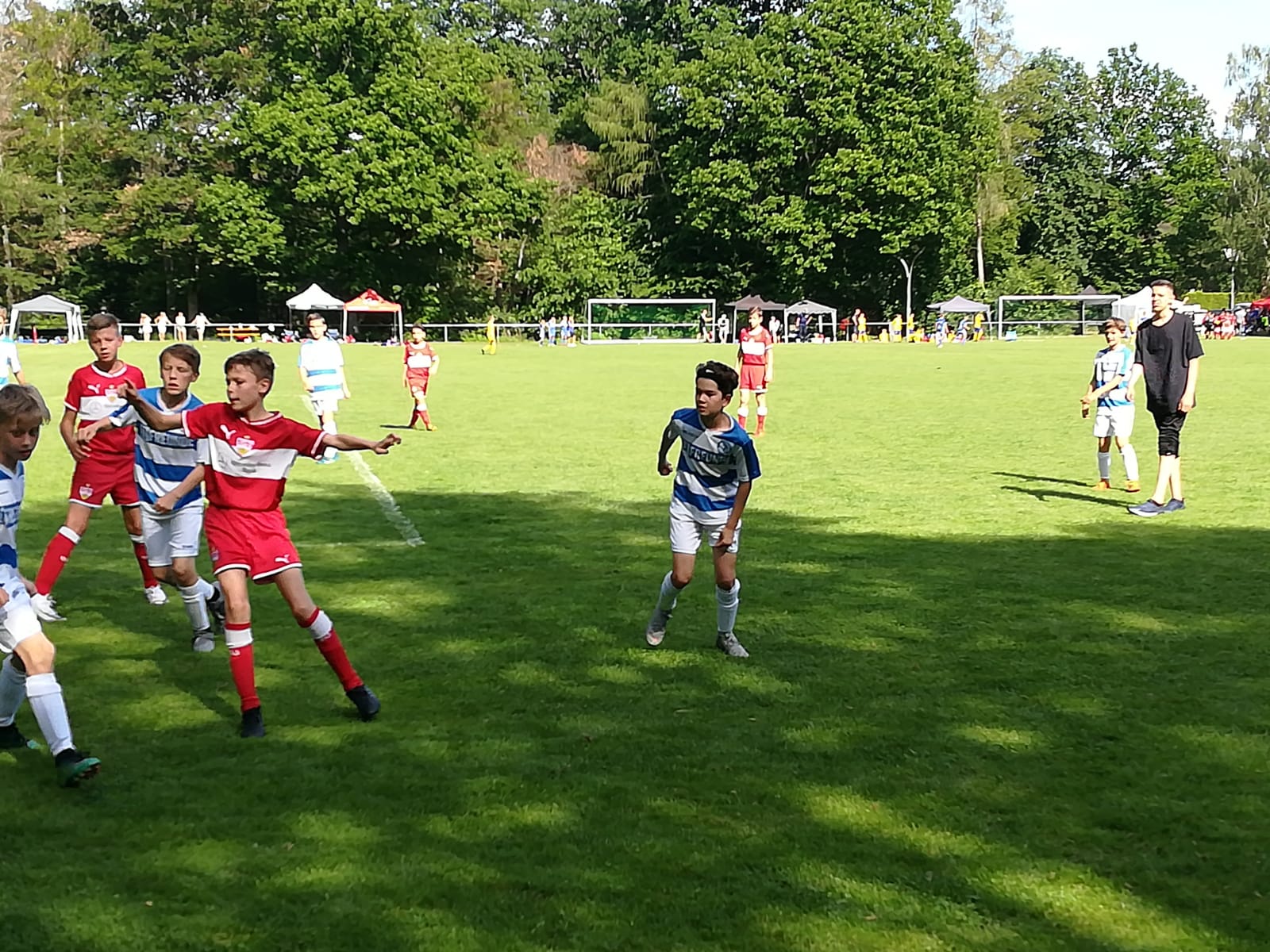 Am Samstagmorgen nach dem Frühstück machten wir uns alle auf den Weg zum Sportgelände der SKV Mörfelden. Dort angekommen lief bereits das Turnier, an dem insgesamt 60 Mannschaften aus aller Welt teilnahmen. Nach einem gemeinsamen Mittagessen bereiteten wir uns auf unser erstes Spiel gegen VV Hoogland aus den Niederlanden vor. Dort mussten wir gleich feststellen, dass international ein anderer Wind weht, was Handlungsschnelligkeit, Passgenauigkeit und Körpereinsatz betrifft. Leider konnten wir unsere Chancen nicht nutzen und verloren mit 0:3.